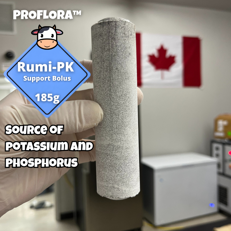 ProFlora™ Rumi-PK Bolus is a 185 g oral bolus designed to support fresh cows during the critical post-calving period. It provides targeted supplementation of phosphorus and potassium—two essential minerals that play a key role in metabolic recovery, maintaining feed intake, and supporting overall performance after calving.